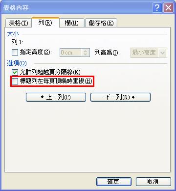 出現下圖後選取 列 這個頁籤,然後將下方的標題列在每頁頂端時重複勾選即可